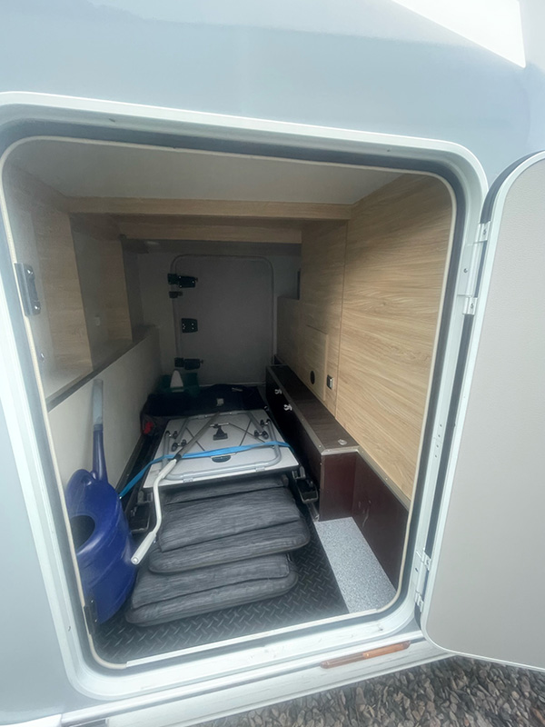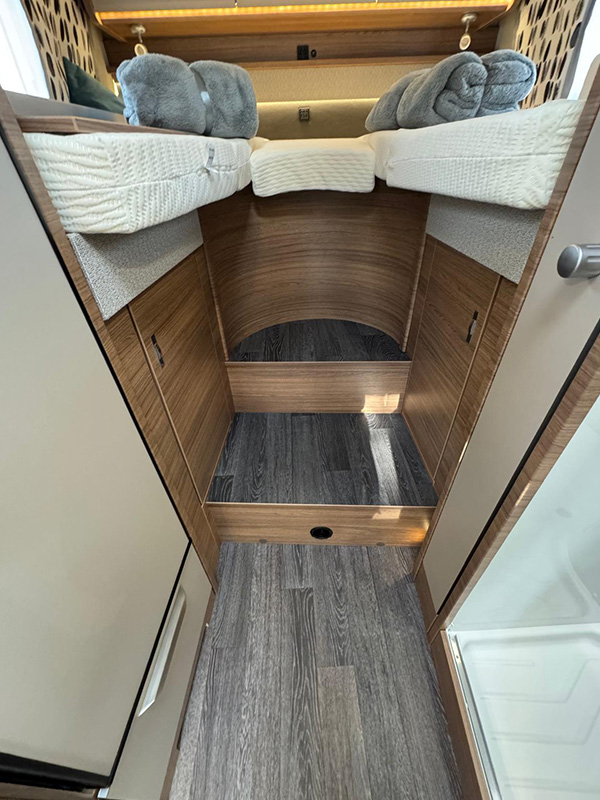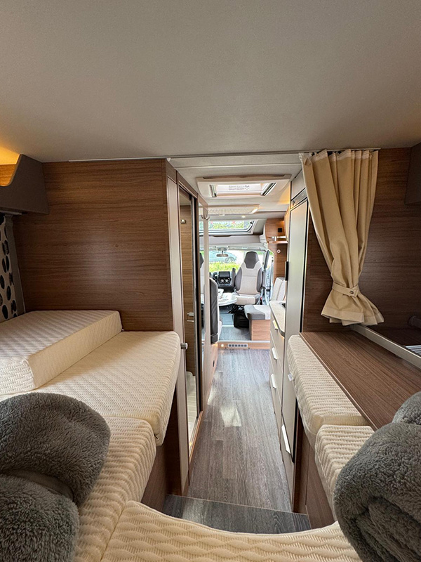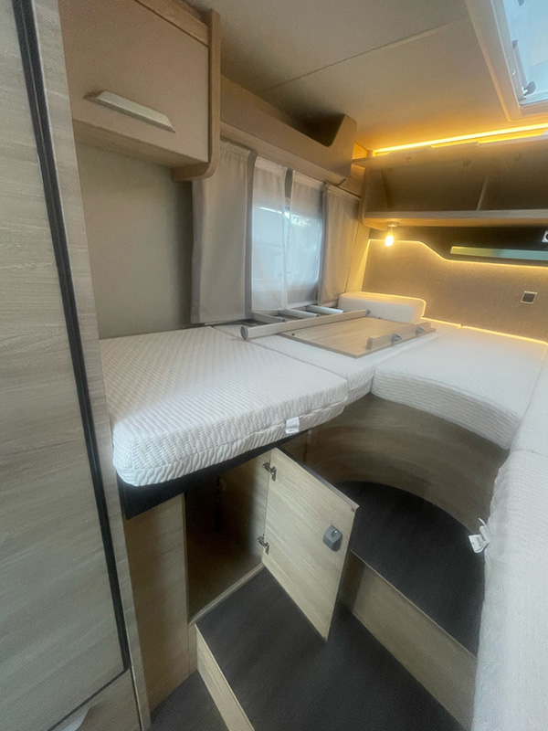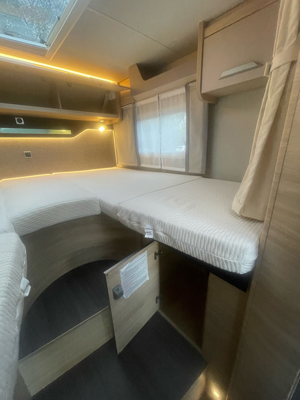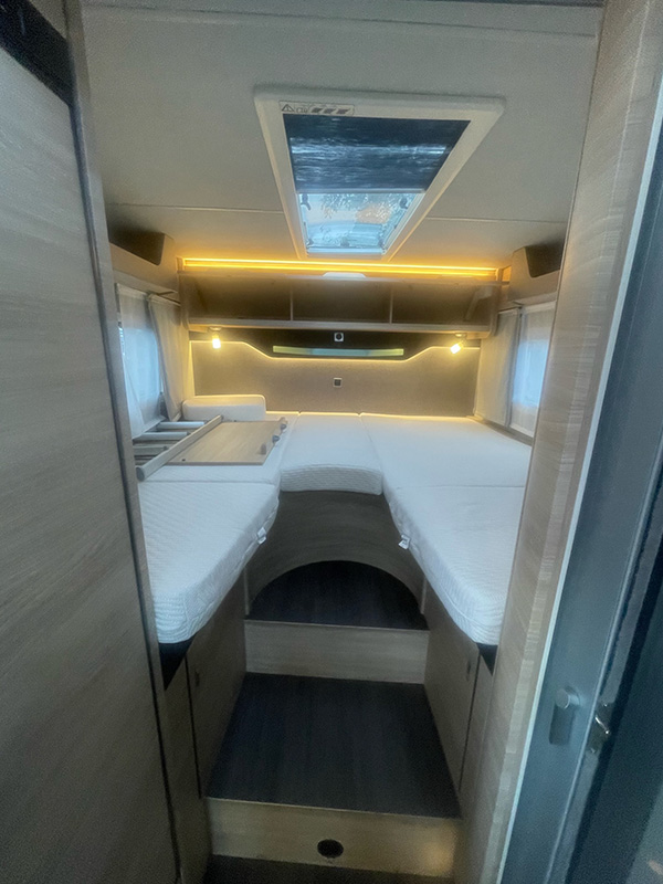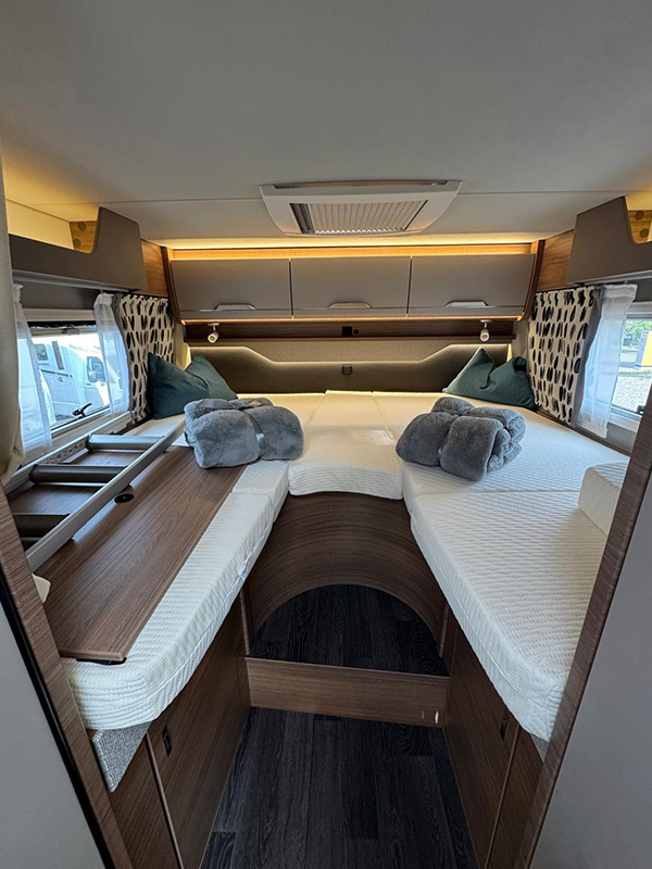 - 2 Schlafplätze (Heckquerbett mit durchgängigem Lattenrost)